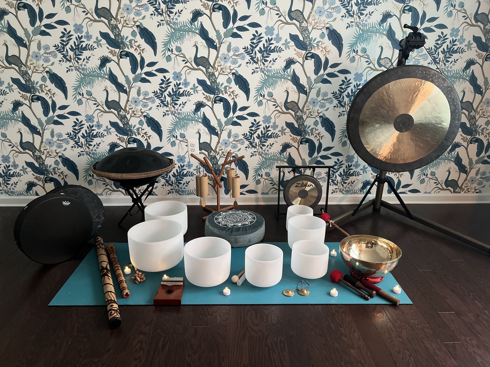 A selection of instruments used during sound healing sessions. Instruments and setup may vary by session and location.